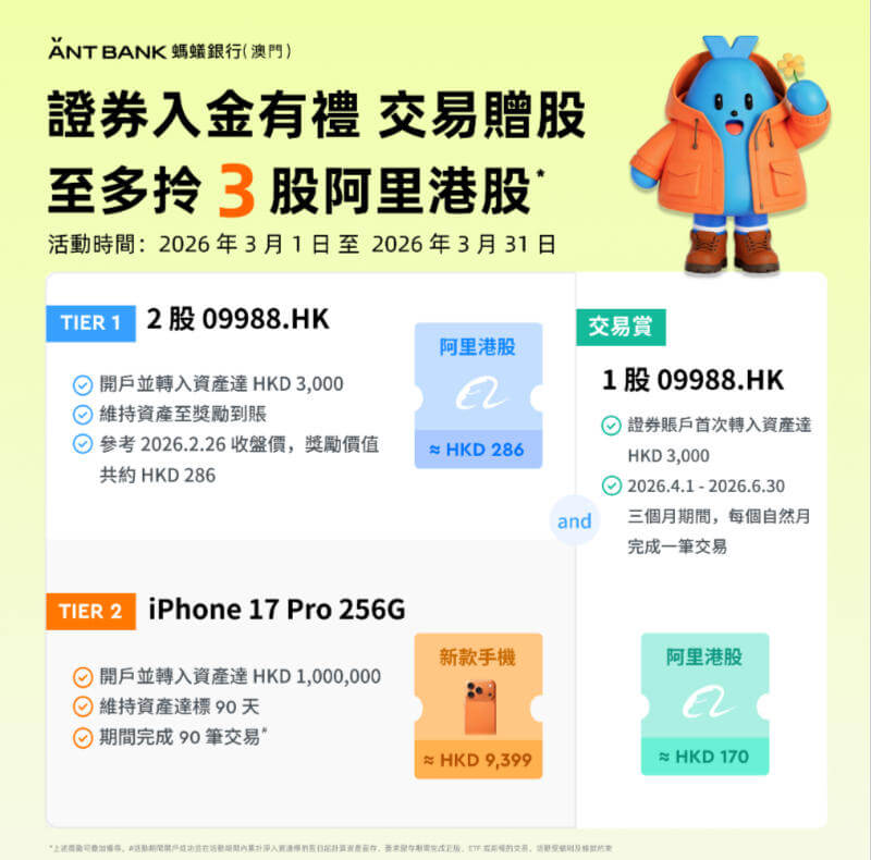 蚂蚁银行(澳门)最新开户攻略,最多可拿3股baba