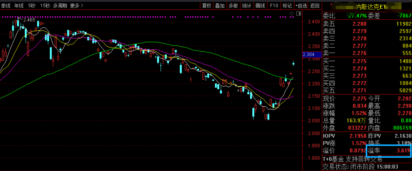这里截取某只纳斯达克ETF的数据,这时的溢价比率是1.79%,这意味着你在场内购买会比场外申购贵1.79%。